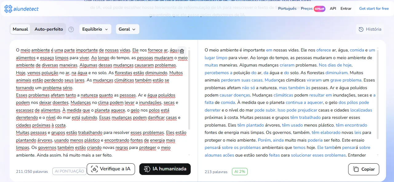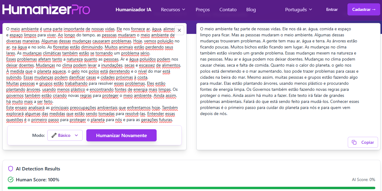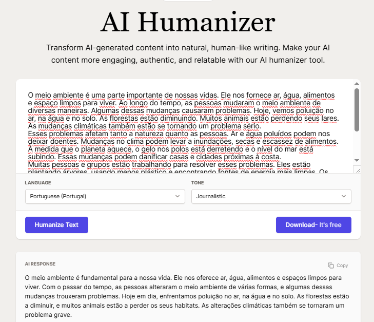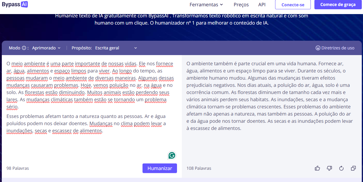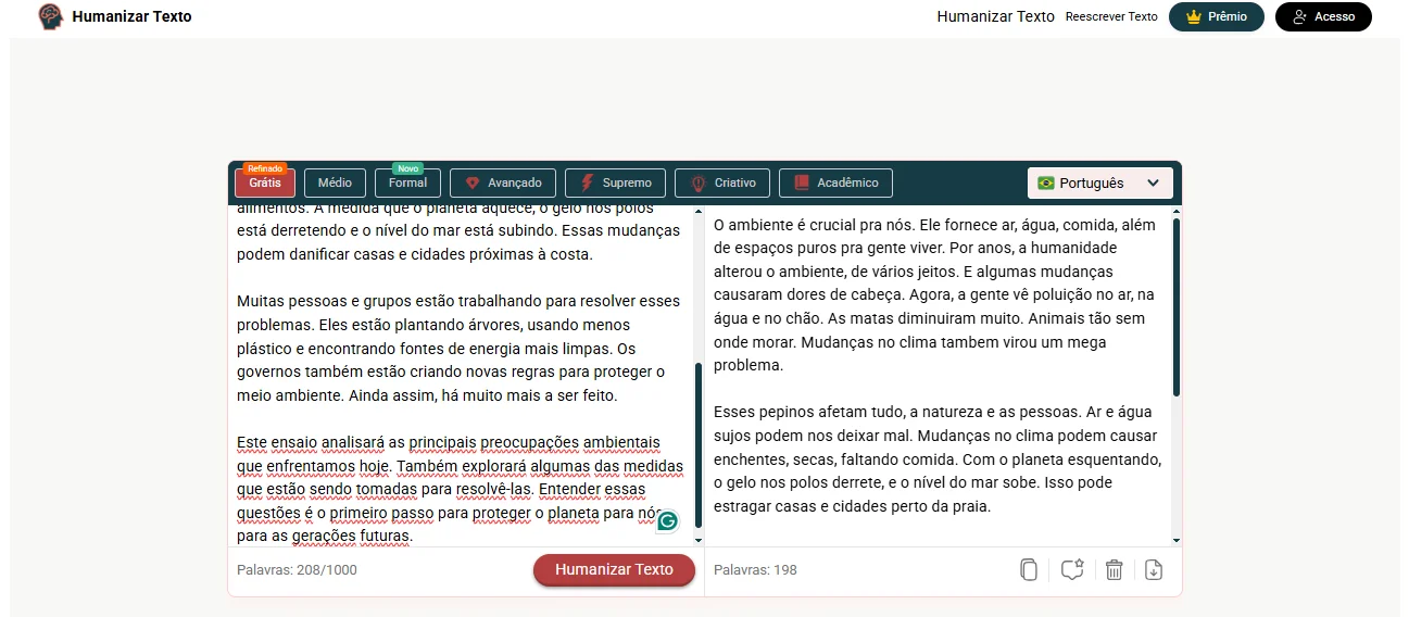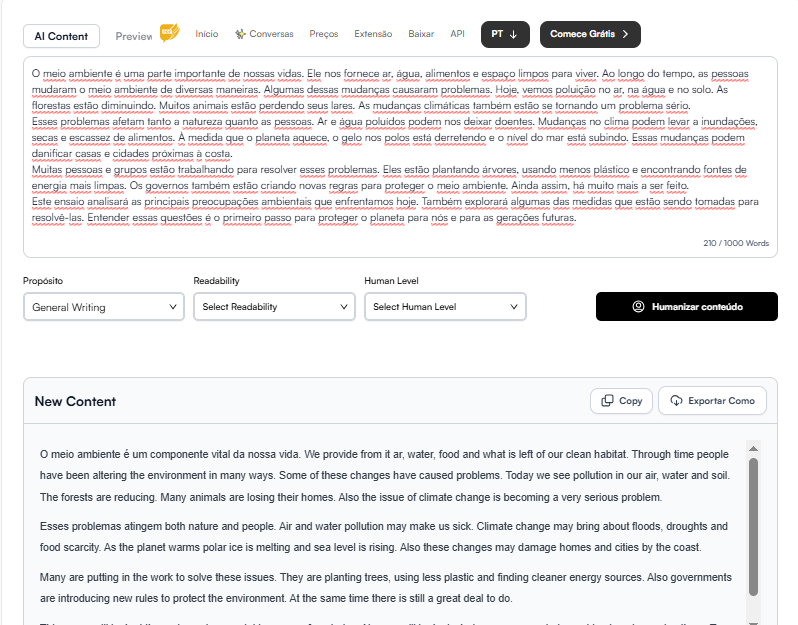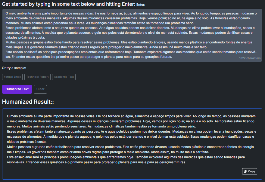 Logo após clicar no botão “Humanizar”, recebi um texto transformado com alterações significativas no conteúdo. Percebi que, embora essa ferramenta não permita a seleção de tons, ela realizou mudanças notáveis.