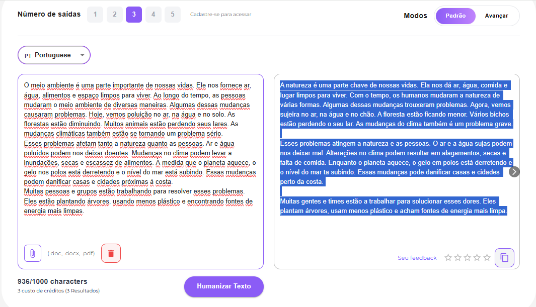 A interface geral desta ferramenta é simples. Primeiro, selecionei o modo padrão, o idioma português e cliquei no botão “Humanizar texto”. Ela me apresentou instantaneamente três resultados distintos entre si.