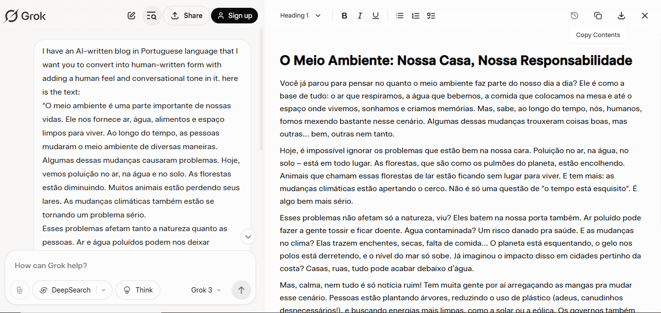 O Grok é uma ferramenta de IA útil com diversos recursos. Achei-o muito útil quando precisei converter um texto digitado em português para uma linguagem mais humana. Usei-o de forma bastante simples, fornecendo as instruções junto com o texto digitado, e ele gerou os resultados conforme o esperado.