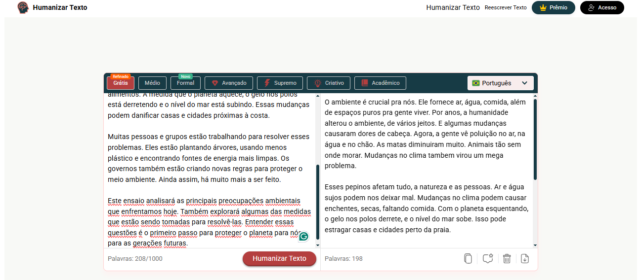 Acredito que o Humanizar-texto.net esteja entre os principais humanizadores de IA gratuitos, capaz de produzir textos extremamente naturais. Este humanizador de IA supera a concorrência devido à sua interface simples e intuitiva e aos diversos modos de humanização que oferece. Prefiro utilizá-lo porque não exige cadastro por e-mail nem verificação.