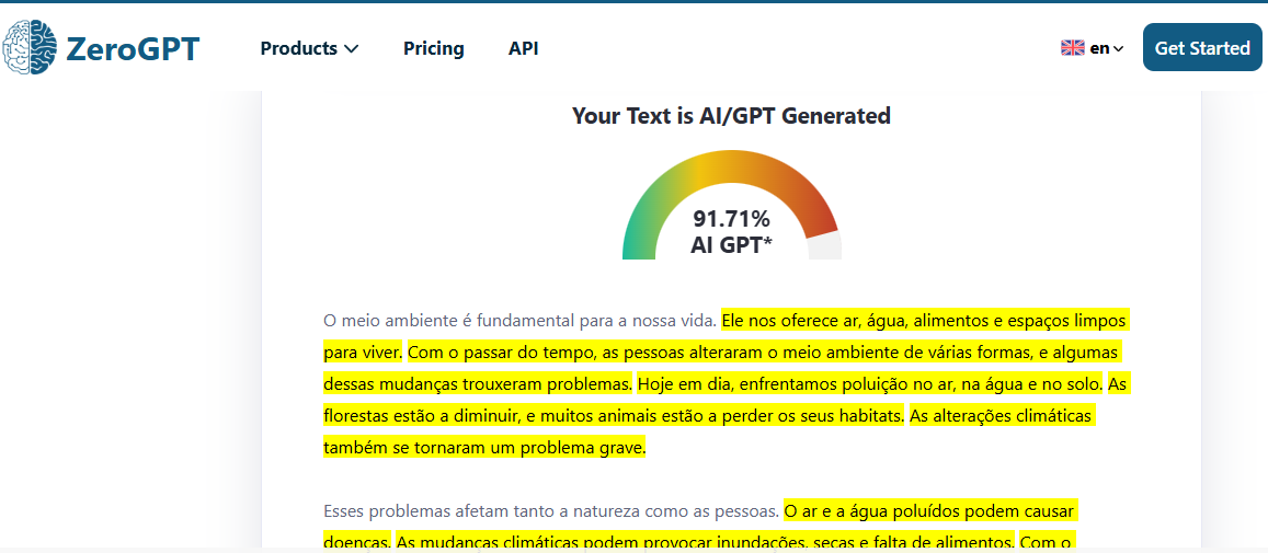 Textos gerados por IA são facilmente detectáveis, pois existe uma variedade de detectores de IA de alta qualidade disponíveis. Os leitores podem reconhecê-los analisando a linguagem formulaica ou robótica, ou podem usar ferramentas de detecção de IA para obter resultados precisos.
