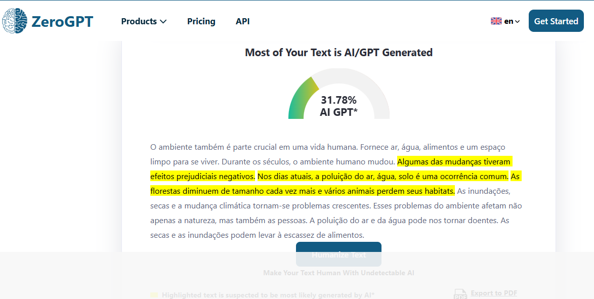 A pontuação de humanização do conteúdo foi baixa porque 31,78% do conteúdo ainda foi detectado como gerado por IA, o que foi uma decepção para mim, assim como será para qualquer usuário da língua portuguesa que busque humanizar seu conteúdo gerado por IA.