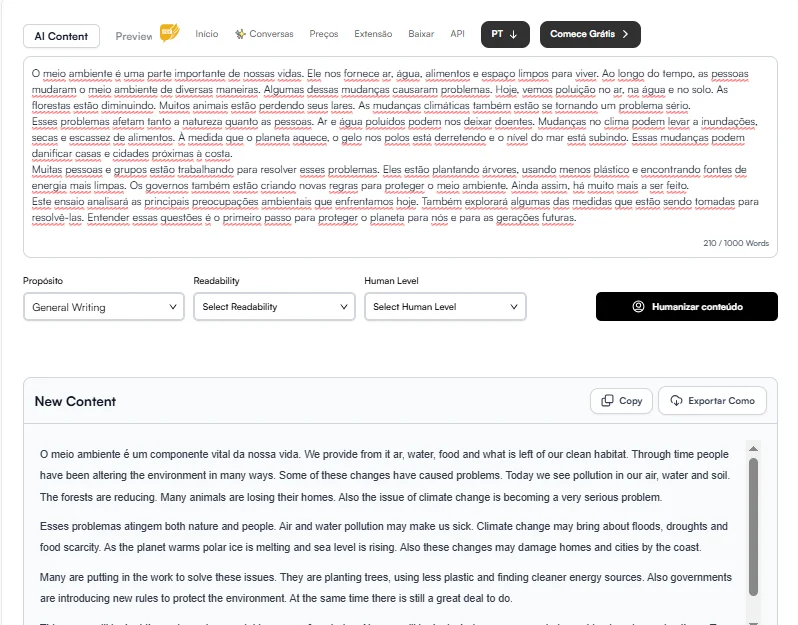 Primeiro, usei o ChatGPT para obter uma saída que converti com a ajuda de diferentes humanizadores de IA. Aqui está o texto: